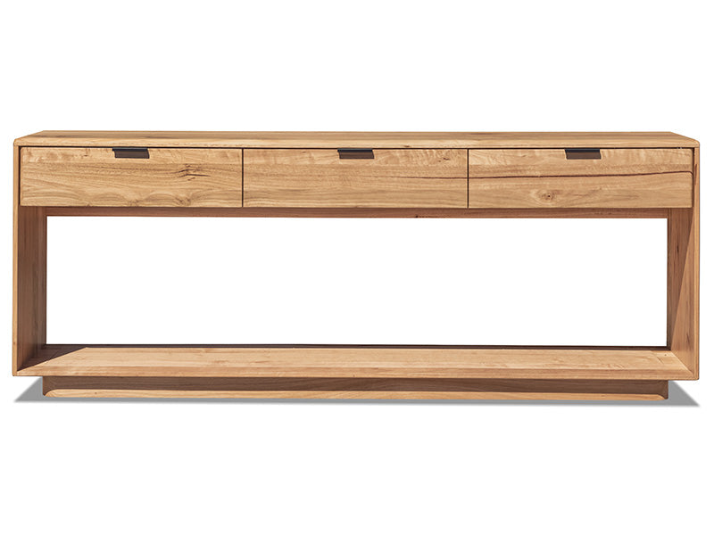 The Donnybrook range features solid Messmate throughout. Messmate is an Australian Eucalypt prized for its beautiful timber grain and suitability for making furniture. The range features softly rounded and sculpted edges and corners. This lovely console features 3 drawers for storage.