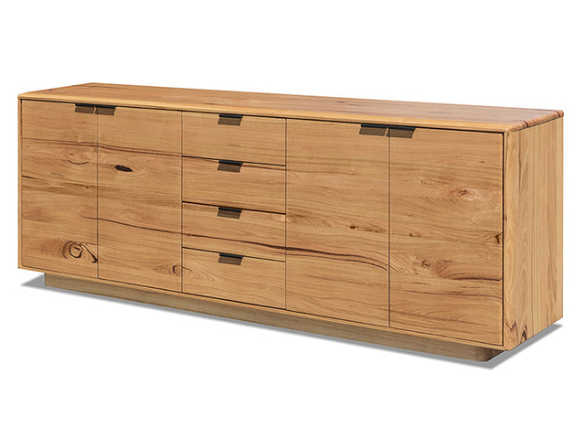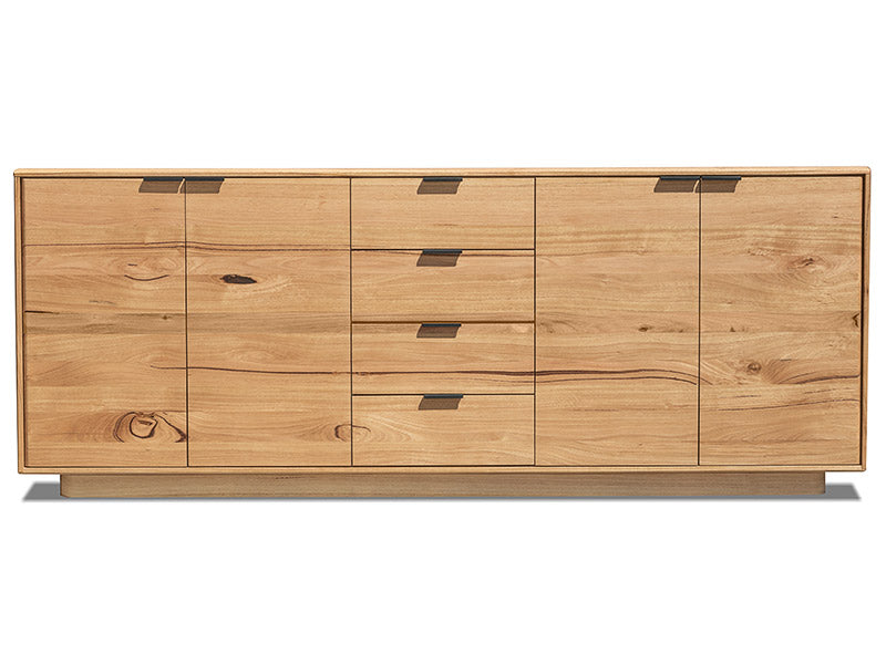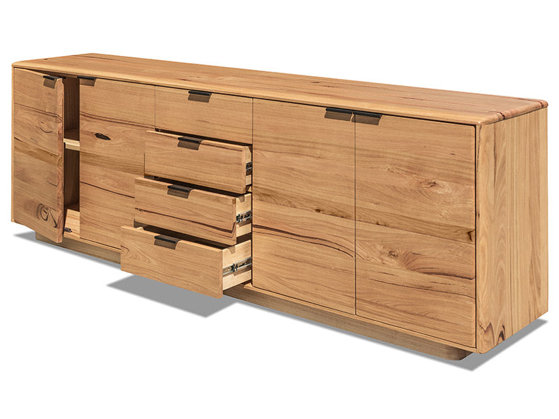 The Donnybrook range features solid Messmate throughout. Messmate is an Australian Eucalypt prized for its beautiful timber grain and suitability for making furniture. The range features softly rounded and sculpted edges and corners. A smaller 1800 buffet is also available.