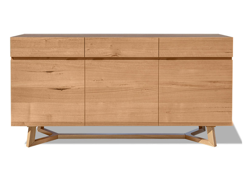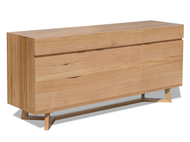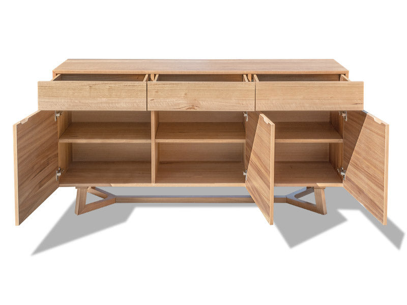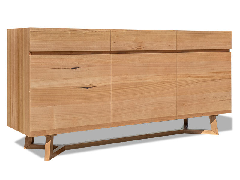 Vasse features a mix of veneer and solid Messmate timber, a beautiful Australian Eucalypt. The sculptural design of the legs is a design feature across the range. The Vasse Buffet is 1680mm wide with 3 storage drawers, and a huge internal space with a large central shelf.