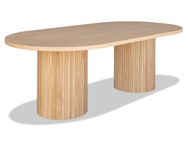 Voyager dining tables are available in 3 distinctly different configurations. Pictured is the 2400 double pedestal table. All Voyager tables feature a mix of solid and veneer Messmate timber with a beautiful slatted base. Messmate is an Australian Eucalypt.