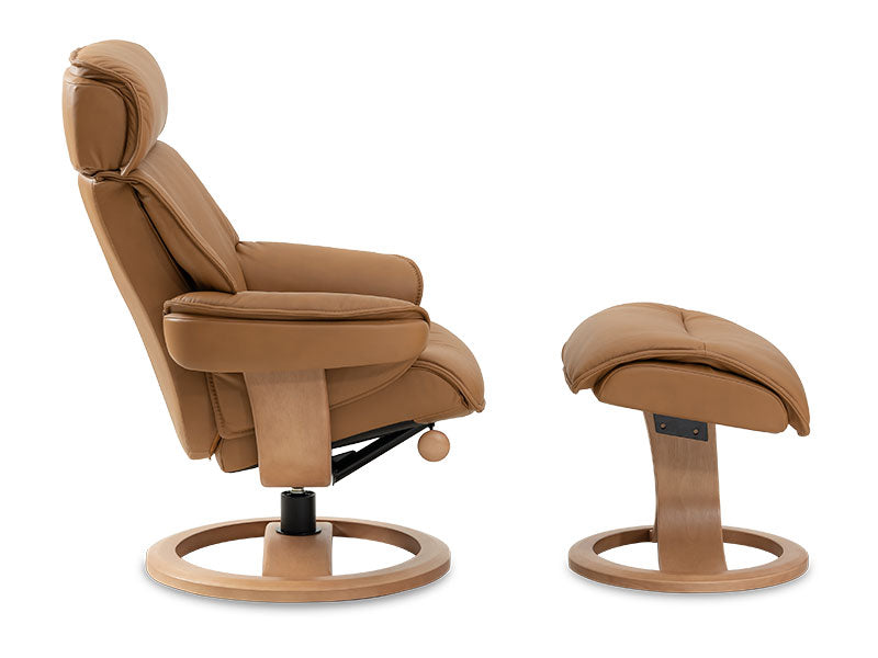 A unique design with a laminated wood yoke and construction frames made of solid steel ensure unquestionable comfort, stability and long lasting quality. The steel frames are covered with high resilience cold-cure molded foam. Available in a wide range of leather colours, fabric colours, and timber frame colours. Nordic 98 is a fully adjustable swivel leather recliner with ottoman.