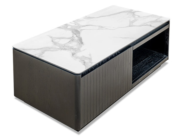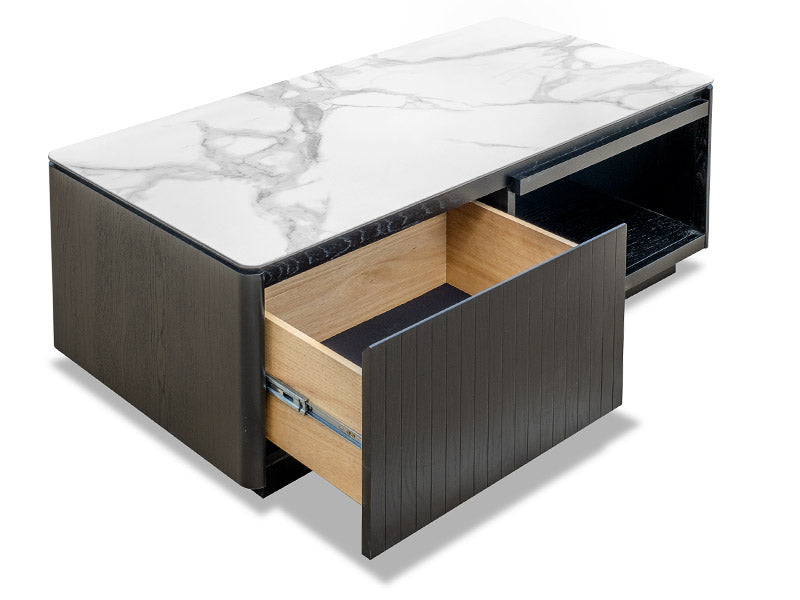 The Toranto Range features black stained White Ash timber and a sintered stone top which is resistant to stains and scratches. The Toranto Coffee Table is a practical 1200 x 600mm and features a pass-thru for magazines and books, plus a generous drawer for extra storage