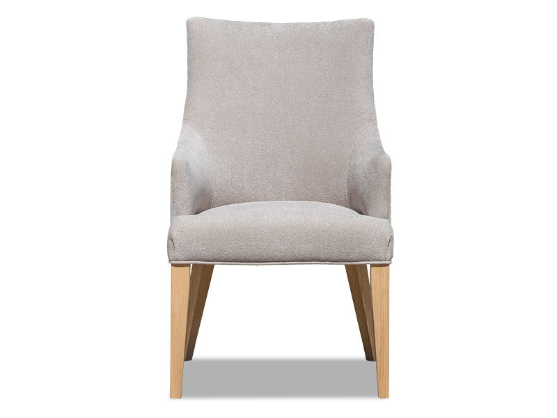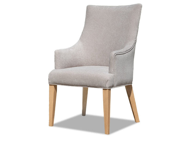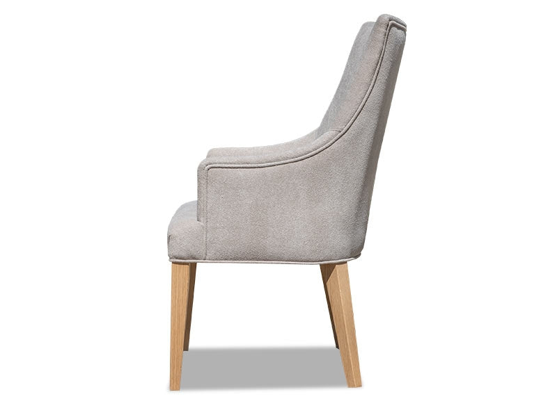 Eva in Exceptional Cobblestone is a lovely high back dining chair, a premium dining chair that looks elegant from all angles. Eva features piped trim all around and offers extra support from the low and curved sides. Natural Oak timber legs and frame. Beautiful and superbly comfortable dining chairs. A refined statement.